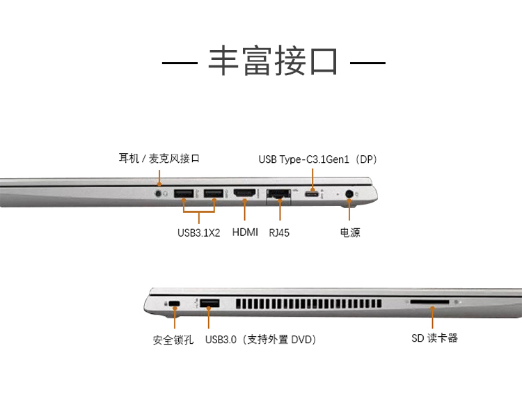 2*USB3.1, 1*USB3.0,1*USB Type-C接口,HDMI接口,耳机/麦克风二合一接口, RJ45(网络接口),电源接口,SD读卡器 |